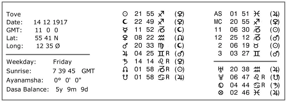 Selvom Sol og Måne befinder sig i tegnet ved siden af Rahu, er der en reel (annular) solformørkelse den 14. december, og uanset om Månen ligger tidligere eller senere end Solen, altså uanset om det er en tiltagende eller en aftagende Måne, er det ikke en Måne, der er badet i Solens velgørende lys, men det er dog en Måne aspekteret af alle de guddommelige planeter: Solen, Jupiter og Mars, som i modsætning til dæmonerne lever evigt. 106 år efter sin fødsel, lever Tove Ditlevsen på en måde iblandt os endnu.