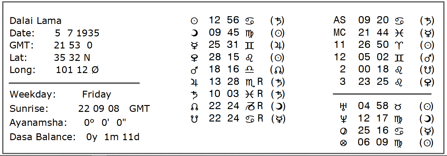 Solen er i en vens, Månens, tegn. Solen og Månen er de to himmellys, to sattviske planeter, hvilket lover godt for inspiration fra de tre sattvitske planeter – Sol, Måne og Jupiter – og de stjernetegn de står i – hhv. Krebs, Jomfru, og Skorpion - som alle er feminine/indadvendte, forskende tegn. Dalai Lama har altid været inspireret af naturvidenskab.