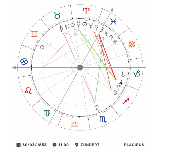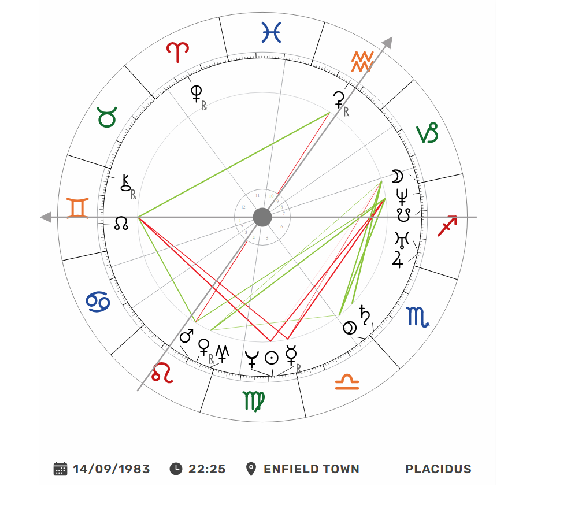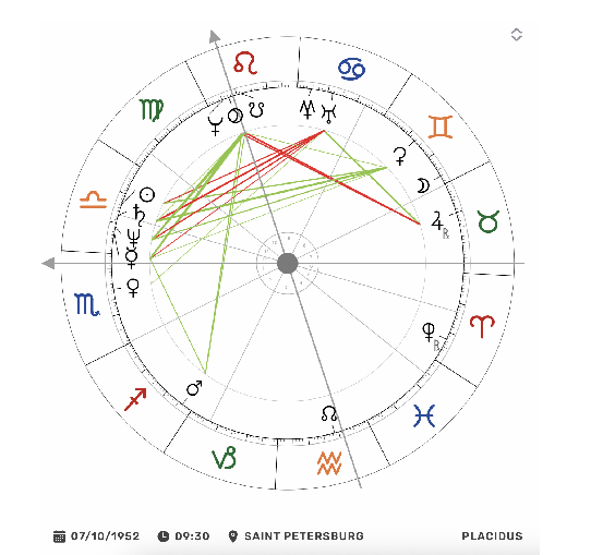Igen er det værd at bemærke, at vi her har et horoskop med dobbelt luft. Sol i Vægt, Måne i Tvilling. Vi får først det fulde billede af horoskopet når vi inddrager den sydlige måneknude i ildtegnet løven, i konjunktion med Pluto og i kvadrat til Jupiter.