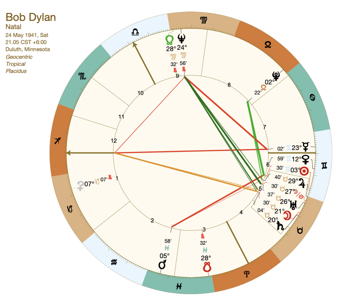 Selvom Bob Dylans kreativitet kan ses i både MC i Vægten samt 4 planeter i 5. hus og Mars i Fiskene i 2. hus (medfødt ressource), så giver den sydlige måneknude i Fiskene et ekstra og vigtigt lag i forhold til kreativitet og spiritualitet. Den sydlige måneknude hersker Neptun i 9. giver et kreativt behov for at udtrykke spiritualitet og kreativitet på filosofiske områder, hvor meningen med livet konstant er i fokus. Den sydlige måneknudes gamle hersker over Fiskene (Jupiter) står i Tyren i 5. hus og understreger det kreative islæt og Tyren tilfører et element af stædig arbejdsomhed. Den er kun 3 grader fra 6. hus og indvirker sikkert også på livsområder forbundet med arbejde, tilegnelse af færdigheder m.m.