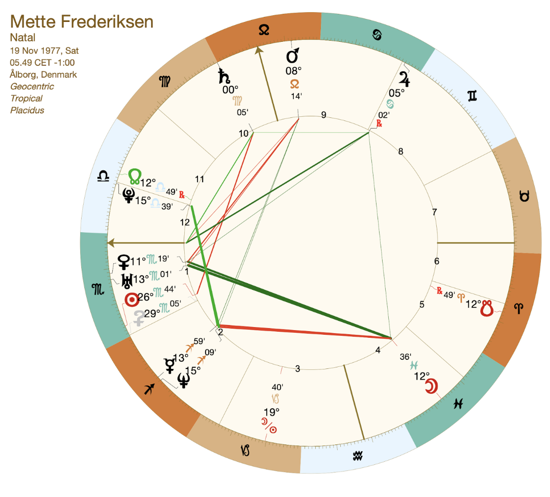 Selvom Mette Frederiksen ganske vist har Mars og MC i Løven samt Merkur i Skytten (alle ildtegn), så giver den sydlige måneknude i Vædderen alligevel et noget andet billede af en Sol, Måne, Ascendant personlighed i vandtegn. Med den sydlige Måneknude i Vædderen har Mette Frederiksen fra tidligere tider været vant til at kæmpe for at overleve (survival of the fittest), hvilket helt klart har vakt en vis genkendelse i hende under såvel Corona krise samt Ukraine krigen og truslen fra Rusland. Med sydlig måneknude hersker i Løven er hun heller ikke bleg for at stå meget personligt frem og i 9. hus at orientere sig ud ad mod den store verden. Den sydlige måneknude i Vædderen står på grænsen af 6. hus og indikerer, at hun kommer fra omstændigheder, hvor hun har skullet håndtere store byrder af pligter og ansvar (6. hus), hvilket er forbundet med Vædderens ”survival” princip. Kniven har været på struben flere gange før, og modig, beslutsom handling har været påkrævet. Oppositionen til Pluto tyder på ydre omstændigheder der tidligere har tvunget hende i knæ med magt og medført afmagt og tab af kontrol.