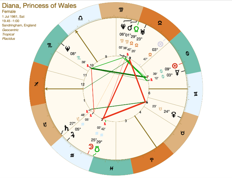 Selv med den sydlige måneknude i Vandbæreren og Månen i Vandbæreren, må vi samtidig skrive os bag øret, at det aldrig var meningen, at Diana skulle væk fra den oprørske og provokerende Vandbærer. Hendes horoskophersker, Jupiter, står i Vandbæreren, og Månen er hersker over hendes Sol. Så en sammenfatning af hendes horoskop kunne f.eks. lyde således: ”Brug dit liv til at være et eksempel på, at man igennem store personlige forvandlingsprocesser kan opmuntre andre til at udleve deres individualitet, stå op imod kvælende autoriteter og involvere sig omsorgsfuldt i at gøre noget godt for andre.