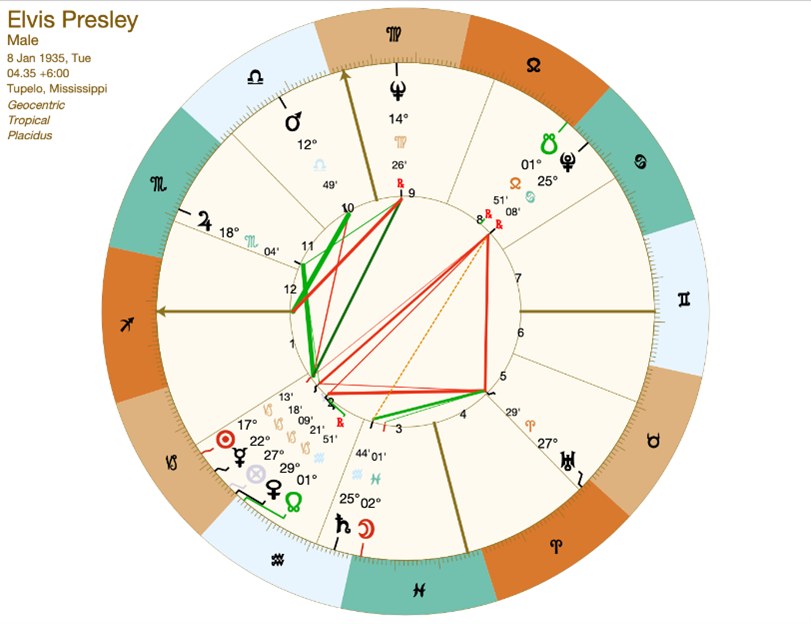 Her ser vi den stik modsatte kombination af Lady Diana. Med den nordlige måneknude i Vandbæreren er stikordene: Objektivitet og originalitet fremfor selvoptagethed og stolthed. Elvis var Løven - den karismatiske, den der automatisk tiltrak sig opmærksomhed og var det store sexsymbol. Hans sjælelige opgave var imidlertid at se sig selv og al opmærksomheden fra et mere objektivt perspektiv. Med den nordlige måneknude i 2. hus er nøgleordene: Opbygning af eget værd og skaberkraft fremfor skjulte begær og afhængighed af andres ressourcer/værdier. Elvis gjorde sig afhængig af sin managers værdier og ressourcer og endte på tragisk vis med at leve fastlåst i en stivnet rolle i Las Vegas, hvor der ikke var meget rebel/vandbærer eller selvstændighed (2. Hus) tilbage. Hvis vi havde haft Elvis i konsultation, kunne følgende ordkombinationer af den nordlige måneknude i tegn og hus være blevet sagt: “Det er vigtigt for dig at iagttage dig selv, dine ressourcer og talenter fra en mere objektiv og upersonlig synsvinkel. Du skal finde værdi i at være anderledes og på kanten af samfundsnormerne. Gå efter at tjene penge på at gøre noget anderledes. Gør oprør mod at tjene penge på konventionelle og forudsigelige måder. I stedet for at betragte sex som en måde at styrke dit ego på eller stive dit ego af med rollen som sexsymbol, så gå efter at skabe noget unikt til gavn for helheden/fællesskabet. Brug dine talenter og ressourcer til at gavne et større formål”.